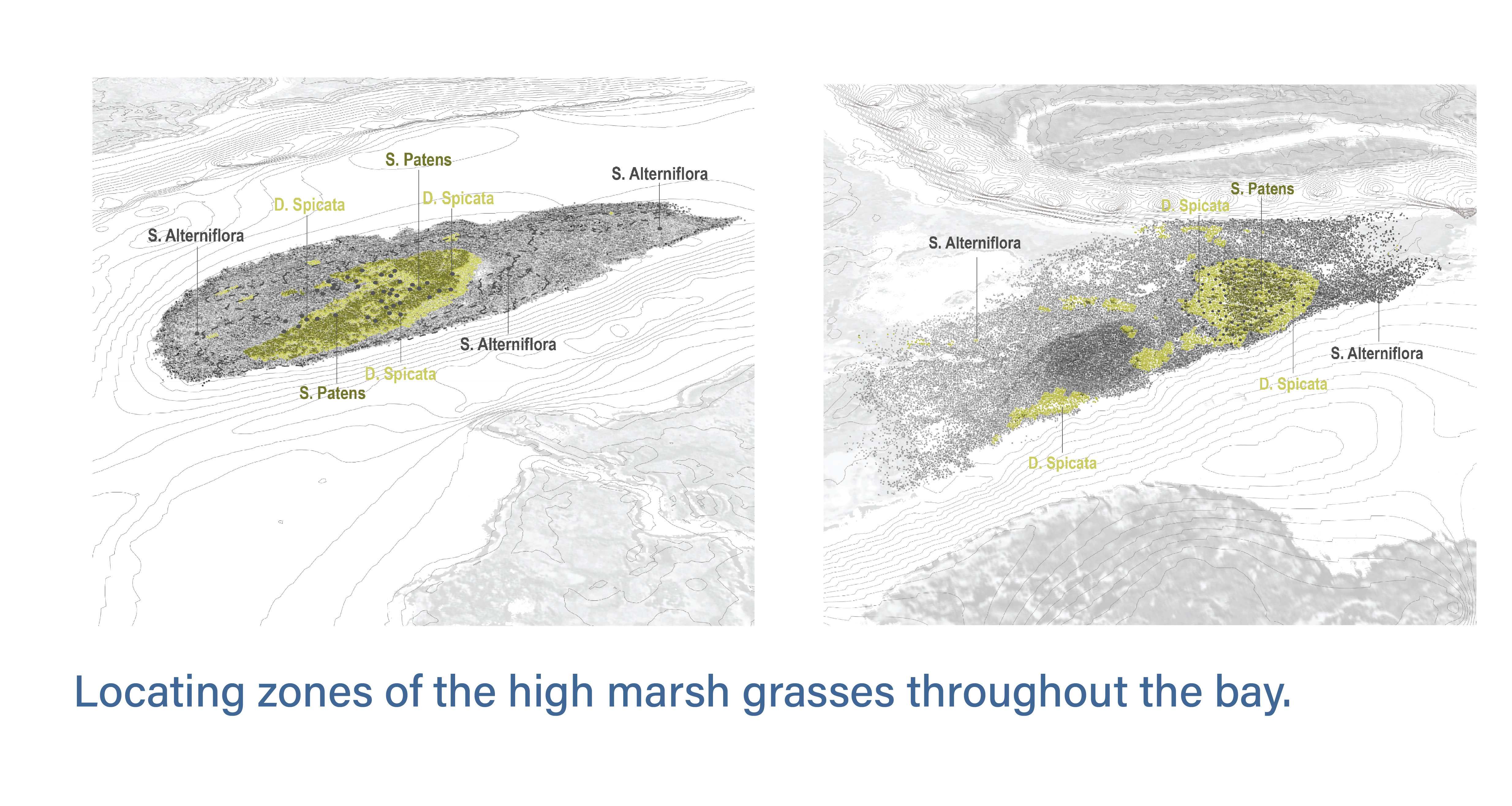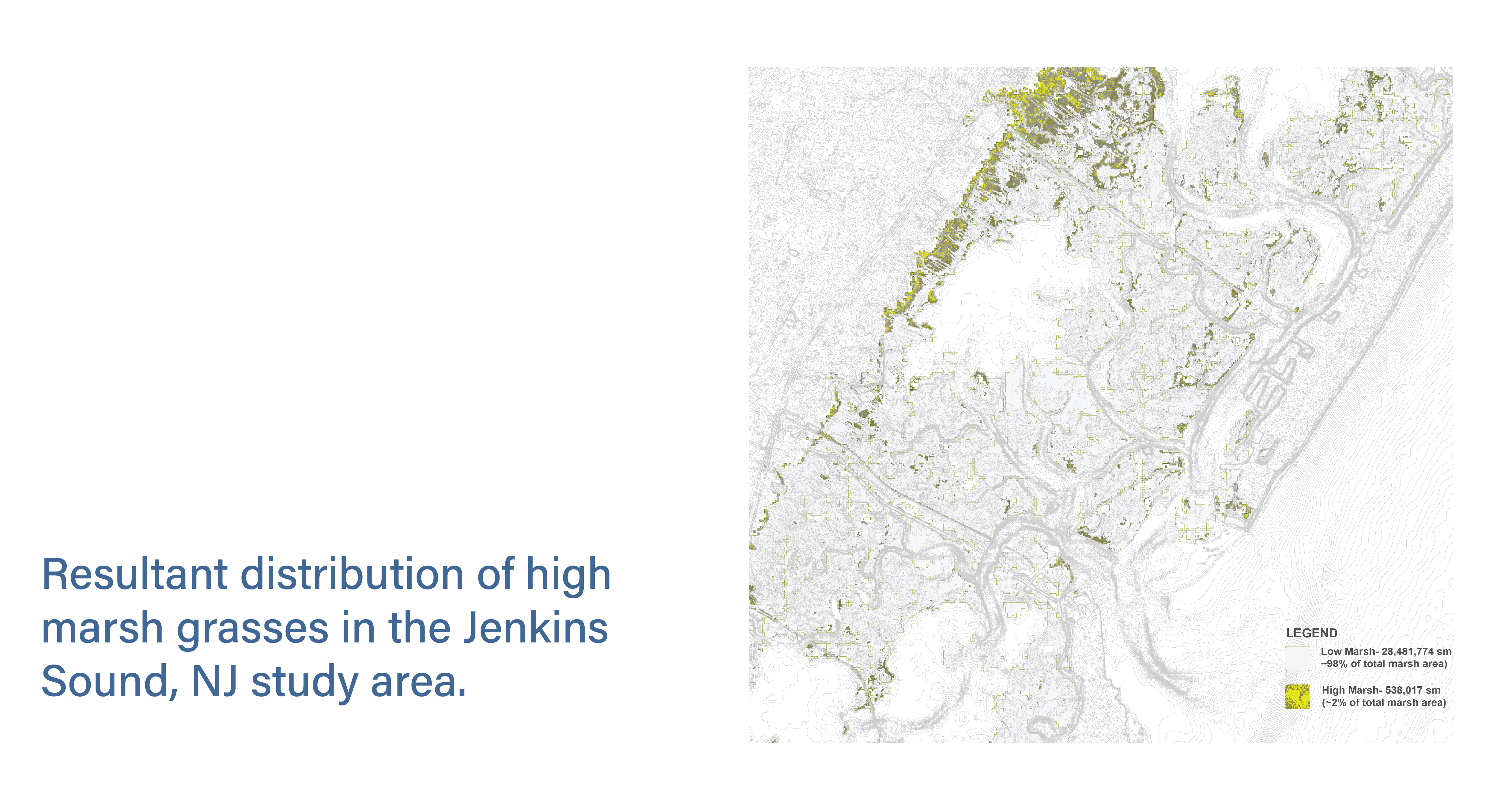 We utilized a UAV equipped with a multispectral camera to capture color infrared images of three out of four surveyed areas in Jenkins Sound, NJ. In next step, I analyzed the multi-band imageries to differentiate key land cover classifications, including open water, developed land, low marsh (Spartina alterniflora), and high marsh (Spartina patens and Distichlis spicata), based on their distinct spectral wavelengths. Elevation data from field surveys were integrated with spectral information to accurately identify and map high marsh zones throughout the bay.