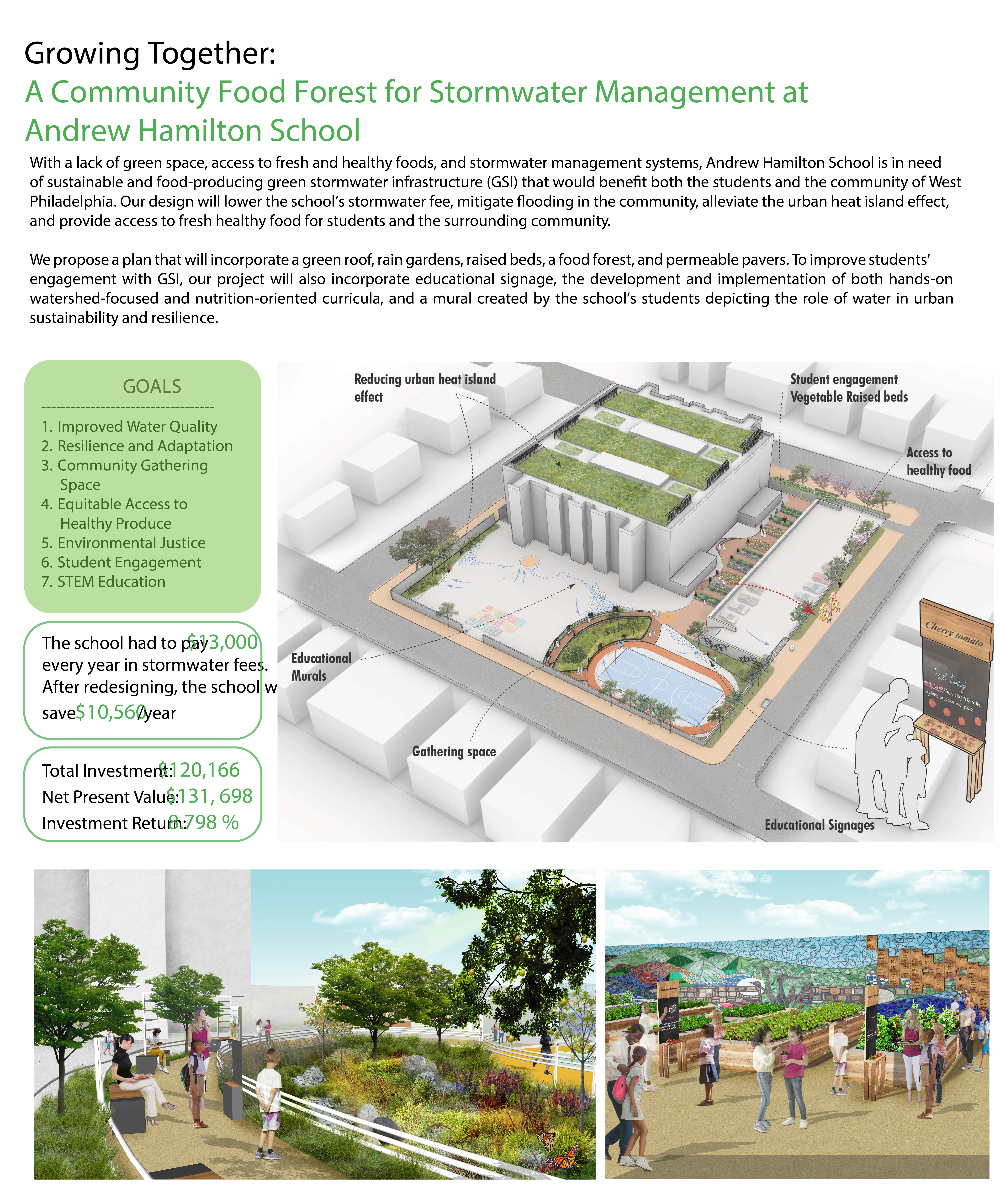 Andrew Hamilton Elementary School in West Philadelphia lacks green space, healthy food access, and stormwater management, underscoring the need for sustainable, food-producing green stormwater infrastructure (GSI) to support students and the community. Our design will reduce the school’s stormwater fees, mitigate local flooding, alleviate urban heat, and improve access to fresh food. Key features include a green roof, rain gardens, raised beds, a food forest, and permeable pavers. To engage students, we’ll add educational signage, watershed and nutrition-focused curricula, and a mural on urban water resilience. Partnering with school leadership and organizations like the Philadelphia Water Department, the Netter Center, and the Philadelphia Orchard Project, we aim to establish AHS as a sustainable community hub.