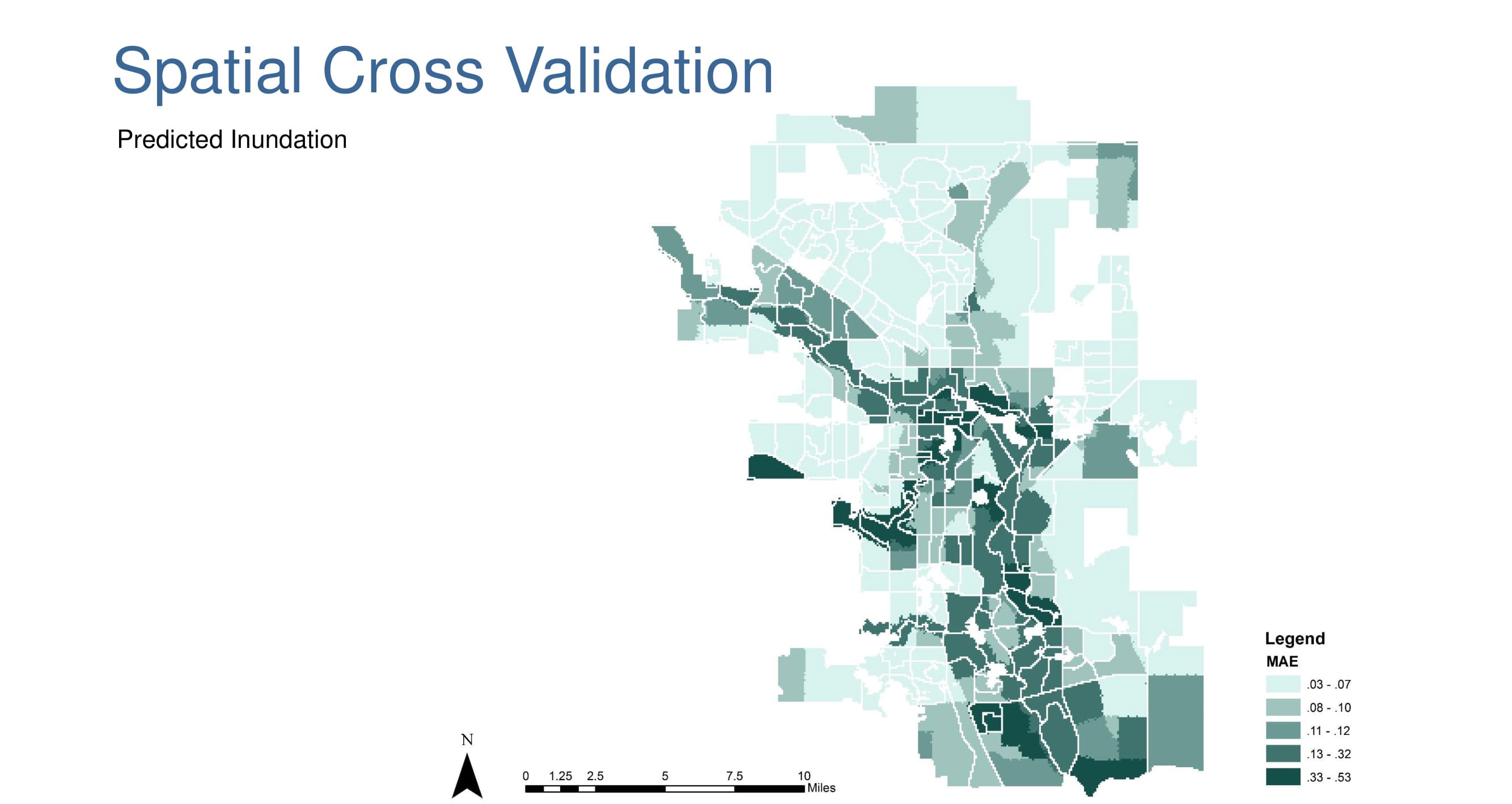 After modeling the logistic regression. Our AUC was 0.91, which indicates that our model is very good at discriminating between flooded and non-flooded pixels. We also performed a spatial cross-validation and mapped the mean absolute errors in each neighborhood. Mean Absolute Errors are lower in neighborhoods that were further from the actual inundation sites and higher near the flooding sites. We hoped that we were predicting better in neighborhoods that were closer to the inundation site, but we still value that we are over predicting in these neighborhoods because it is better to be prepared for an even more catastrophic flood.