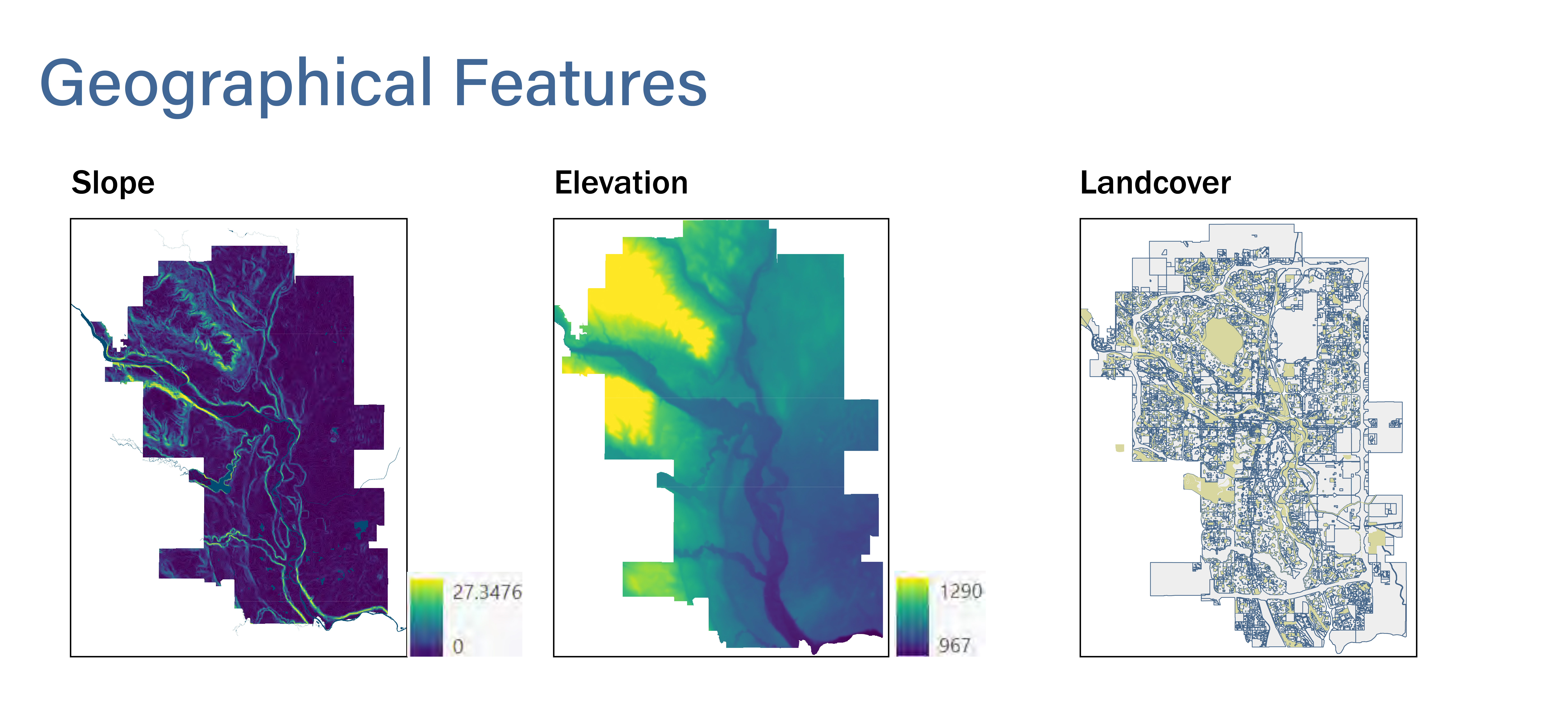 In the feature engineering phase, we took four different categories of variables, including Geographical, spatial, social and census data as predictive variables to capture the characters of flooding locations. For instance, we included Elevation, Slope, and Landcover to represent the geographical condition of Calgary.