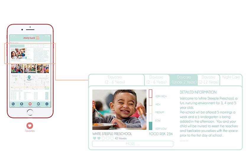 This APP has five main interfaces Search, Nearby, Favorite, Report and More to help new parents select a daycare center. It will not only equip them with the most detailed information of all the daycare centers in Chicago, but also help report the food safety issues that users found in food safety in any daycare center, and keep in touch with the parents or the food inspection departments.