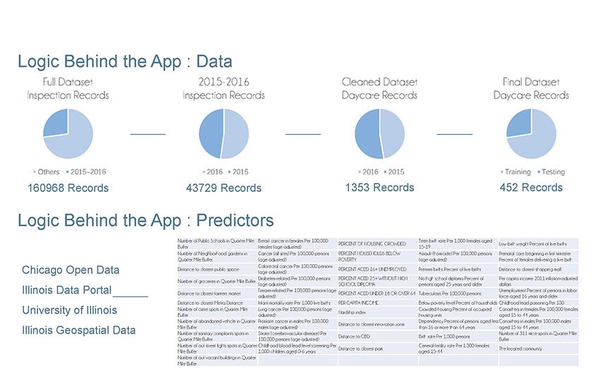 The data of building this model comes from the primary data set of food inspection in Chicago. In the model, we used the daycare centers’ 2015 to 2016 data. The independent variables are mostly found from online open data sets including Chicago Open data, which include the daycare center previous inspection result, the community’s sanitary data, social economic data and statistics about the residents’ health conditions.