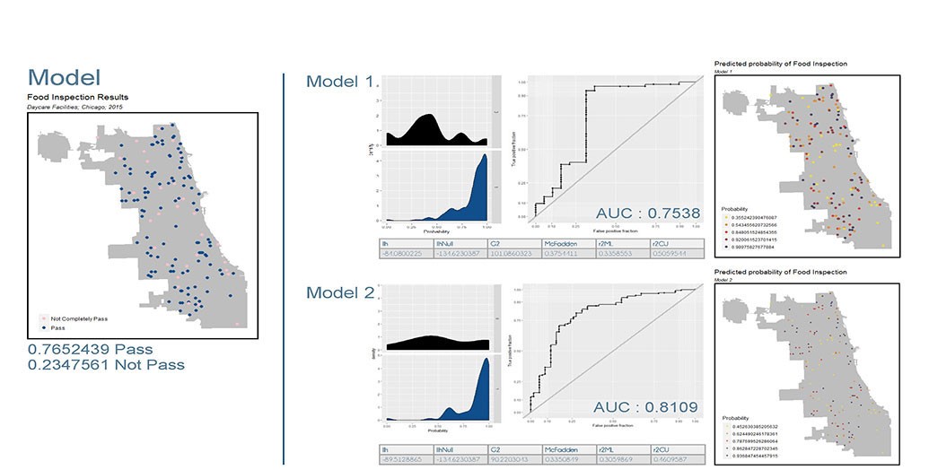 The logic behind the APP is a logistic regression model. It has a high AUC value of 0.81, which indicates that there might be 19 percent error in the food inspection results, which is good in accuracy but not over predicting. By checking the results spatially, the high probabilities of pass are all located close to the results of pass, and the results of significant coefficients are not surprising because the sanitary condition complaints and the history inspection results are displayed as most significant predictors.