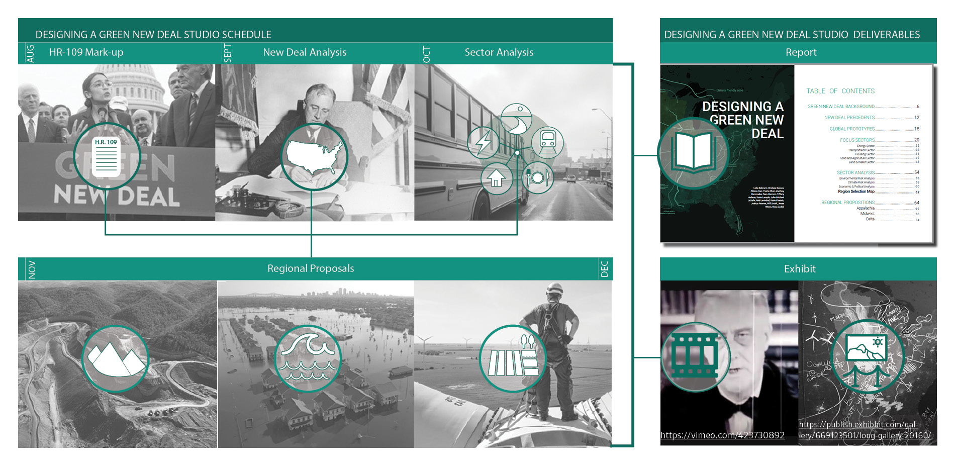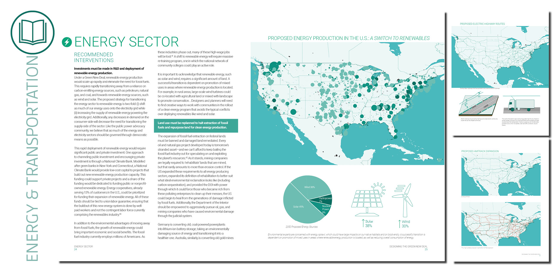 In the "Designing a Green New Deal" studio, we tackled two central questions for the Green New Deal (GND): (1) which U.S. regions should be prioritized to meet GND goals on carbon reduction, justice, and jobs, and (2) where initial investments should be directed. The studio’s efforts led to a public exhibition and policy brief aimed at involving landscape architects in climate politics and sparking public engagement with the GND.