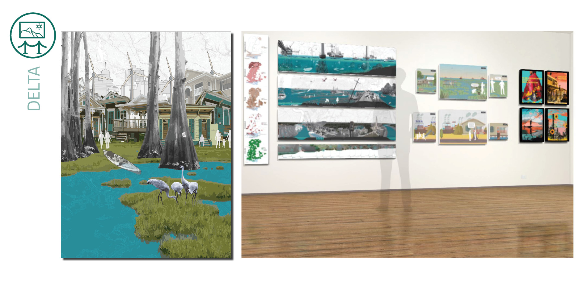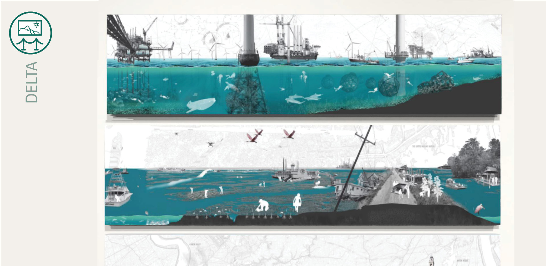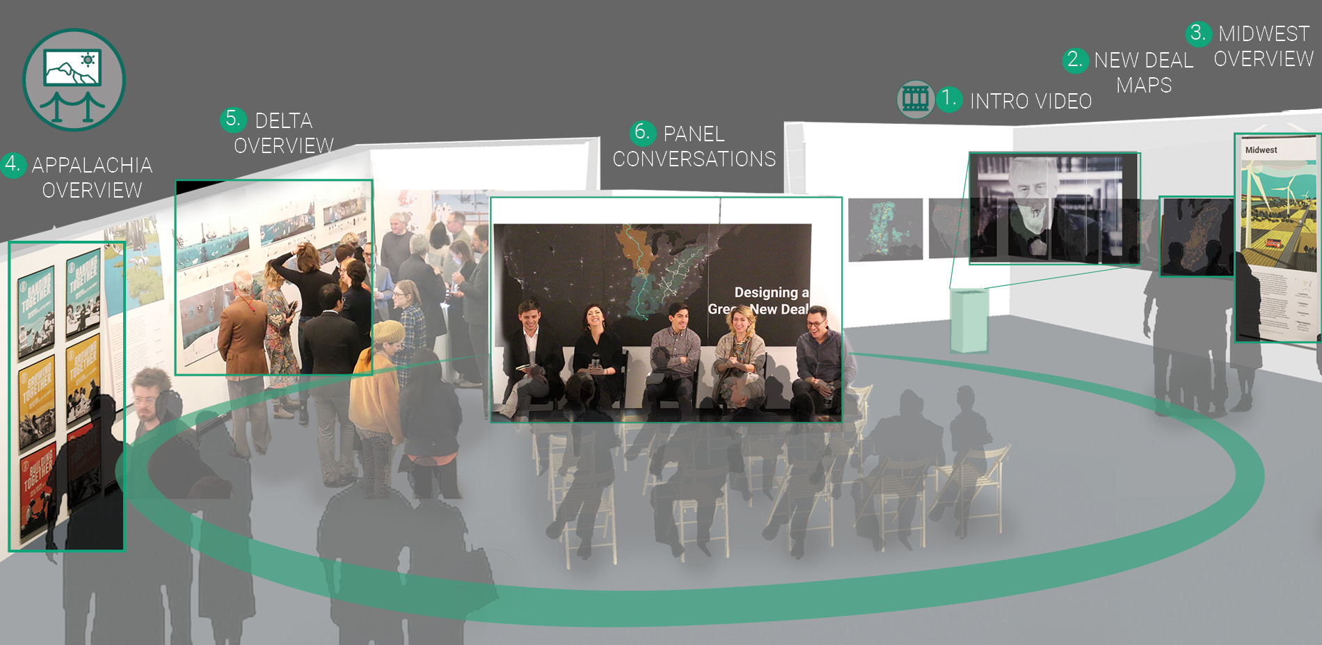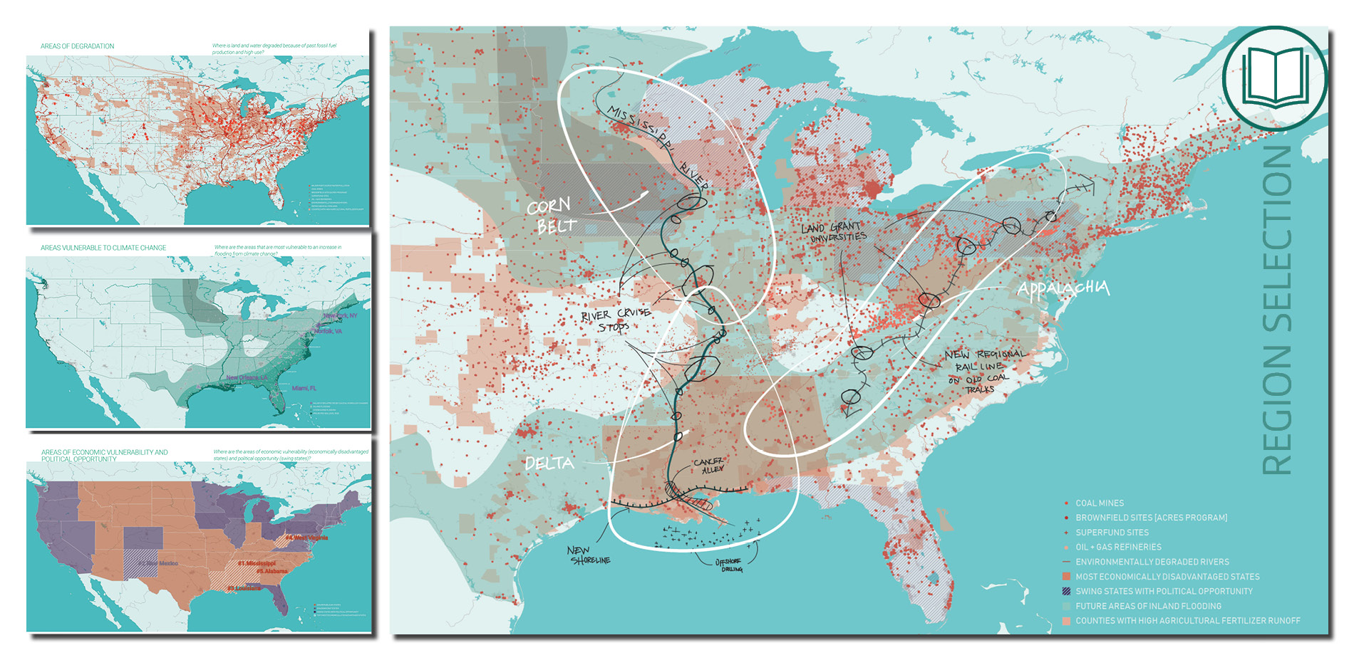 To engage the public with the transformations resulted from Green New Deal, a public exhibition of work aimed at communicating three core messages: (1) the New Deal’s transformative impact on the environment, (2) the importance of prioritizing Appalachia, the Delta, and the Midwest, and (3) the GND’s potential for both large-scale interventions, like a regional rail line, and community-focused projects, like regenerative farming.